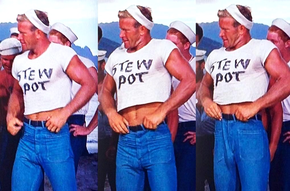 One of these many hunks of yore was Ken Clark. We first enjoyed his dancing singing denim dick display in South Pacific as Stewpot. My preteen musical theatre joy blended with fascination as Clark even adjusts his jeans to show off his ball bulge.